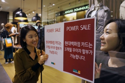 최근 신용카드사의 가맹점 무이자할부 결제가 중단돼 고객들이 불편을 겪고 있다. 이에 현대백화점은 현대백화점카드로 상품대금을 결제할 경우 3개월 무지아 할부가 가능하다는 안내 고지물을 9일 매장 곳곳에 부착했다.