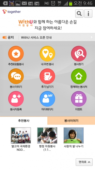 김정수 CSR실장은 “위드유가 어려움에 처한 사람들과 자원봉사의 손길을 필요로 하는 봉사단체는 물론, 자원봉사로 나눔을 실천하고자 하는 모두에게 유익한 도움이 될 것으로 기대한다”고 말했다.