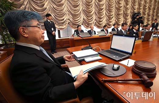 김중수 한국은행 총재가 11일 오전 서울 중구 한국은행 본관에서 열린 금융통화위원회 본회의를 주재하고 있다.