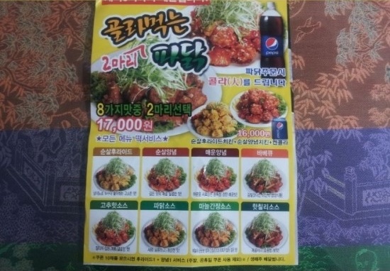 전단지에는 2마리를 한 마리 가격으로 준다며 먹음직스러운 치킨 사진과 함께 치킨 주문 시 음료를 무료로 제공한다는 설명이 적혀있다.