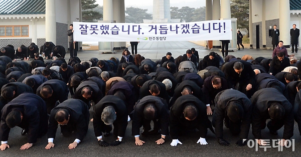 문희상 민주통합당 비상대책위원장과 지도부들이 14일 오전 동작구 국립서울현충원에서 참배한 후 국민들께 사죄의 절을 올리고 있다.