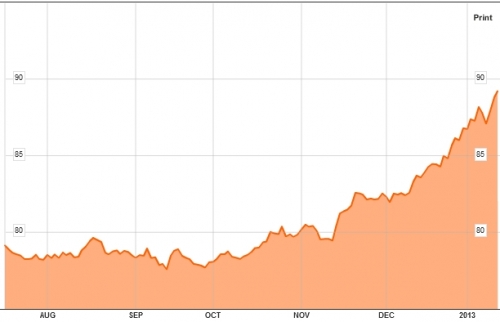 싱가포르외환시장에서 달러·엔 환율은 14일(현지시간) 오전 89.67엔을 기록하며 90엔선에 육박했다고 블룸버그통신이 보도했다. 이는 2010년 6월 이후 최고 수준이다.