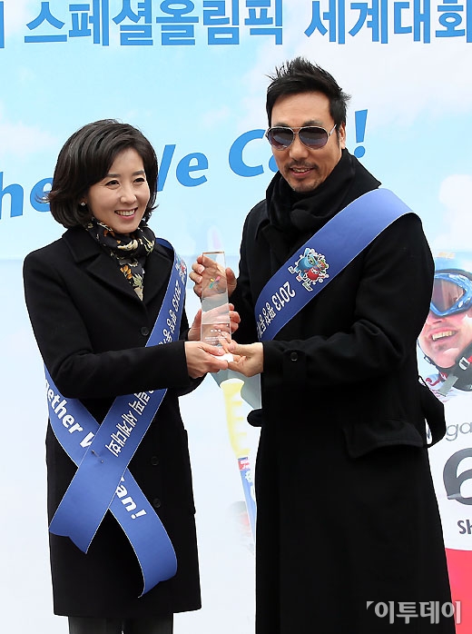 스페셜올림픽을 보름 앞둔 14일 오전 서울광장에서 열린 '서울시민과 함께하는 스페셜올림픽'행사에서 스페셜올림픽위원회 나경원 위원장(왼쪽)이 가수 이문세에게 홍보대사 위촉패를 전달하고 있다.