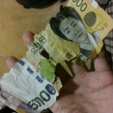 사진엔 너덜너덜 찢겨진 5만원짜리 지폐와 이를 바라보는 강아지의 얼굴이 담겨 있다. 강아지가 5만원짜리 지폐를 물어뜯은 것으로 보인다.