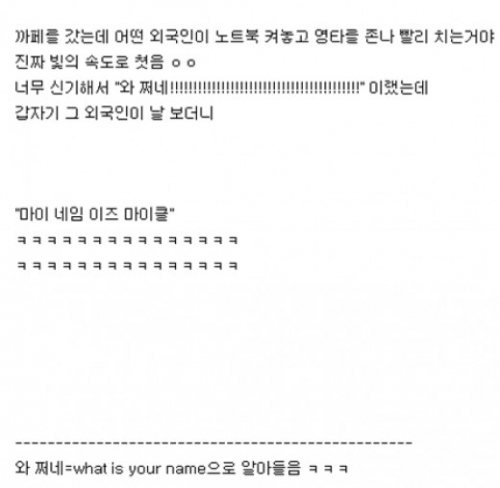 이 글의 게시자는 외국인의 영타 속도에 놀라서 "와 쩌네"라고 말했더니 외국인이 "마이 네임 이즈 마이클"이라고 답하더라며 당황스러웠던 상황을 전했다. 게시자는 "외국인이 ‘와 쩌네’를 ‘What is your name’으로 잘못 알아들은 것"이라고 설명했다.
