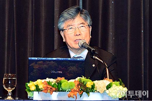 김중수 한국은행 총재가 16일 오전 서울 중구 소공동 롯데호텔에서 한국금융연구원이 주최로 열린 금융경영인 조찬강연회에서 ‘국내외 경제여건 점검 및 2013년 전망’이란 주제로 강연하고 있다.