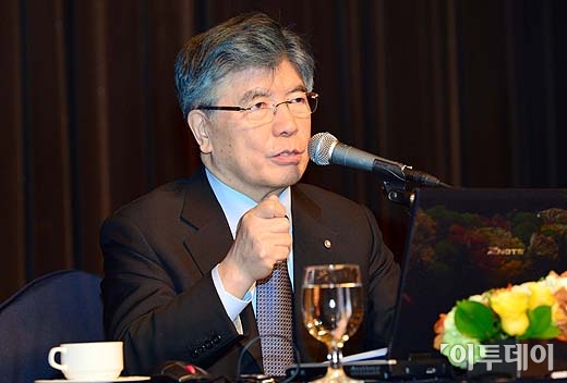 김중수 한국은행 총재가 16일 오전 서울 중구 소공동 롯데호텔에서 한국금융연구원이 주최로 열린 금융경영인 조찬강연회에서 ‘국내외 경제여건 점검 및 2013년 전망’이란 주제로 강연하고 있다.