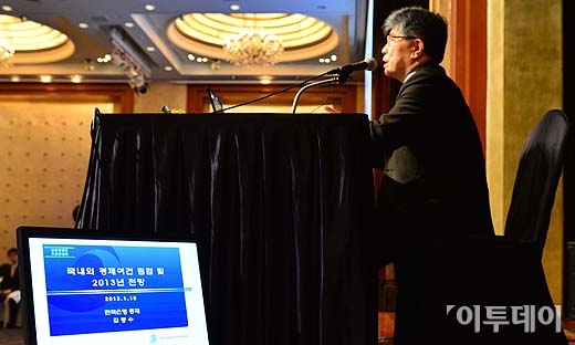 김중수 한국은행 총재가 16일 오전 서울 중구 소공동 롯데호텔에서 한국금융연구원이 주최로 열린 금융경영인 조찬강연회에서 ‘국내외 경제여건 점검 및 2013년 전망’이란 주제로 강연하고 있다.