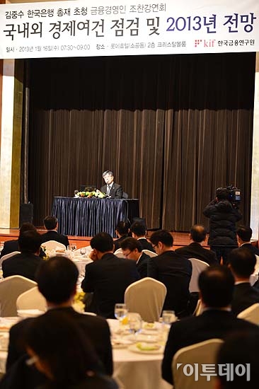 김중수 한국은행 총재가 16일 오전 서울 중구 소공동 롯데호텔에서 한국금융연구원이 주최로 열린 금융경영인 조찬강연회에서 ‘국내외 경제여건 점검 및 2013년 전망’이란 주제로 강연하고 있다.