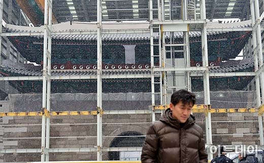 방화로 소실됐던 ‘국보 1호’ 숭례문 복원이 막바지에 들어간 16일 오전 서울 남대문 지붕에 눈이 쌓이고 있다.