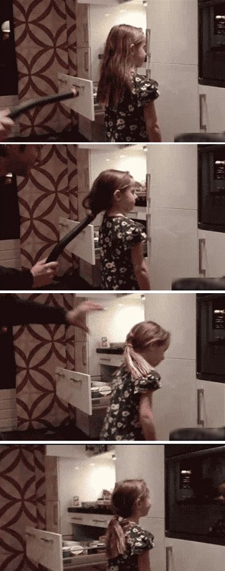동영상에는 진공청소기를 이용해 딸의 머리를 불과 5초 만에 묶어 주는 아빠가 등장한다.