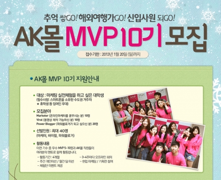 AK몰이 오는 20일 까지 대학생 마케팅 서포터스 ‘MVP서포터스’ 10기를 모집한다고 18일 밝혔다.