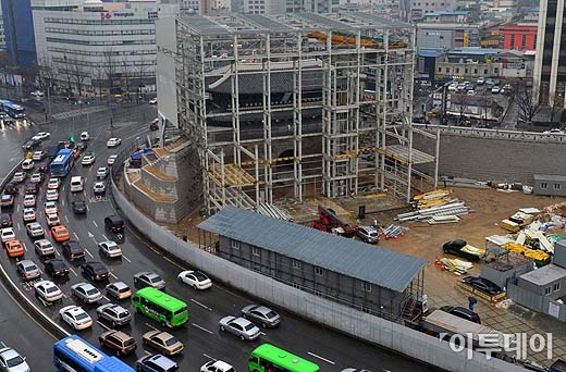 방화로 소실됐던 ‘국보 1호’ 숭례문 복원공사가 막바지에 들어간 21일 오전 서울 숭례문 지붕위를 덮고 있는 가림막이 철거돼 전체모습을 보이고 있다. 2008년 2월10일 방화사건으로 전소된 숭례문은 다음 달 중순 경 복구를 마치고 국민들에게 공개하는 행사를 가질 예정이다.