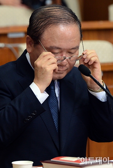 이동흡 헌법재판소장 후보자가 21일 오전 여의도 국회에서 열린 임명동의안 심사를 위한 인사청문회에 참석해 안경을 고쳐 쓰고 있다. 노진환 기자 myfixer@