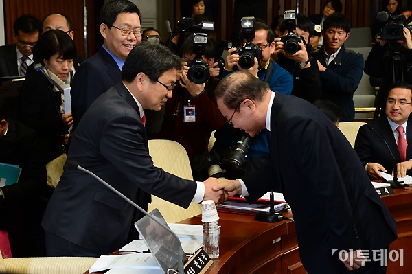 이동흡 헌법재판소장 후보자가 21일 오전 여의도 국회에서 열린 임명동의안 심사를 위한 인사청문회에 참석해 강기정 위원장과 인사를 나누고 있다. 노진환 기자 myfixer@