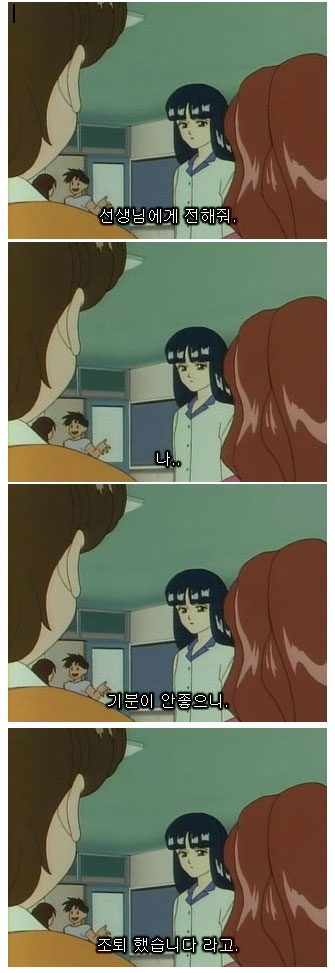 만화의 한 장면으로 보이는 그림 속에는 한 여학생이 교실에서 다른 친구와 대화를 하고 있다. 이 여학생은 친구에게 "선생님에게 전해줘, 나... 기분이 안 좋으니, 조퇴했습니다 라고" 전달해 달라고 한다.