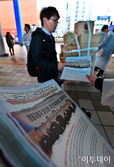 김규한 쌍용자동차 노조위원장을 비롯한 임직원들이 21일 오전 서울역에서 ‘쌍용자동차 정상화 추진과 국정조사 반대를 위한 대국민 홍보활동’을 펼치며 시민들에게 청원서를 나눠주고 있다.