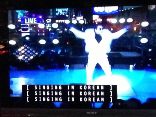 해당 사진 속에는 싸이가 무대 위에서 열정적인 퍼포먼스를 펼치고 있다. 하지만 싸이 가사 자막 포기한 방송사는 ‘한국말로 노래하는 중(SINGING IN KOREAN)’이라고 문구를 대체했다.