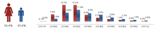 30대 후반 부터는 여성과 남성이 역전되기 시작한다. 30대 후반 남성은 전체 여행객 중 8.0%를 차지 , 여성(6.4%) 보다 1.6% 포인트 높았으며 이같은 양상은 40대 초반으로도 이어졌다.