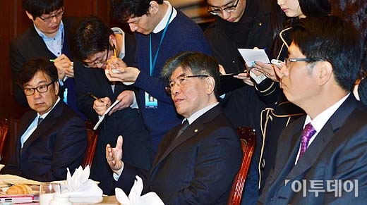 김중수 한국은행 총재가 22일 오전 서울 중구 남대문로 한국은행 본관에서 열린 ‘경제동향간담회’에서 참석자들과 이야기를 나누고 있다. 이날 간담회에는 최운규 경제연구원장, 조동철 KDI 국제정책대학원 교수, 조준모 성균관대 교수, 김창로 한국석유화학협회 상근부회장, 박우규 SK경영경제연구소장, 채욱 대외경제정책연구소장, 박영탁 한국기계산업진흥회 상근부회장 등이 참석했다.
