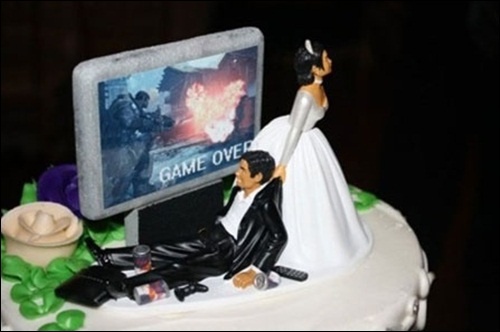 자세히 살펴보면 '흔한 게이머의 케익'에는 게임오버라고 적혀있는 컴퓨터 모니터와 신랑을 질질 끌고 가는 신부의 모습이 등장한다.
