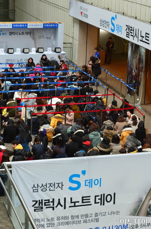 22일 오후 서울 삼성동 코엑스에서 '삼성전자, 갤럭시 노트데이' 행사가 열린 가운데 참가자들이 입장권을 받기 위해 줄지어 기다리고 있다.