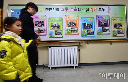 2013학년도 초등학교 취학아동 예비소집일인 23일 서울 종로구 경운동 교동초등학교에서 예비초등학생이 학부모와 함께 참석하고 있다. 서울시 교육청에 따르면 저출산과 도심 공동화 현상으로 서울에서 신입생이 50명 미만인 초등학교가 35곳에 이르는 것으로 나타났으며 서울 교동초등학교는 올해 15명이 입학하여 서울에서 신입생이 가장 적은 학교가 되었다.