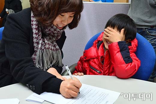 2013학년도 초등학교 취학아동 예비소집일인 23일 서울 종로구 경운동 교동초등학교에서 예비초등학생이 학부모와 함께 참석해 자기소개서를 작성하고 있다. 서울시 교육청에 따르면 저출산과 도심 공동화 현상으로 서울에서 신입생이 50명 미만인 초등학교가 35곳에 이르는 것으로 나타났으며 서울 교동초등학교는 올해 15명이 입학하여 서울에서 신입생이 가장 적은 학교가 되었다.