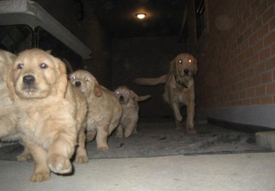 사진 속에는 강아지 한 무리가 줄을 지어 이동하는 모습이 찍혀있다. 똘망똘망한 눈빛을 반짝이며 묵묵히 행군하는 강아지들의 모습이 귀엽다.