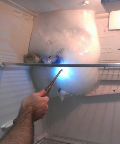 사진 속에는 고장난 냉장고의 모습이 담겨 있다. 해당 냉장고 안쪽 벽에는 얼음 덩어리가 붙어있다. 주인은 불을 이용해 냉장고의 얼음을 녹이고 있어 시선을 사로잡는다.