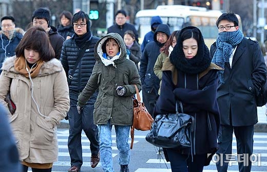 서울 아침 기온이 영하 9.8도 체감온도는 영하 17도까지 떨어지며 한파주의보가 내려진 25일 오전 서울 광화문네거리에서 시민들이 몸을 움츠린채 출근을 서두르고 있다.