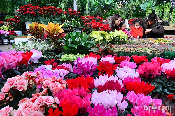 서울 최저기온이 영하 11도까지 떨어지는 등 매서운 한파가 몰아치고 있는 27일 오전 서울 양재동 화훼공판장을 찾은 시민들이 알록달록 봄꽃들을 살펴보고 있다. 노진환 기자 myfixer@