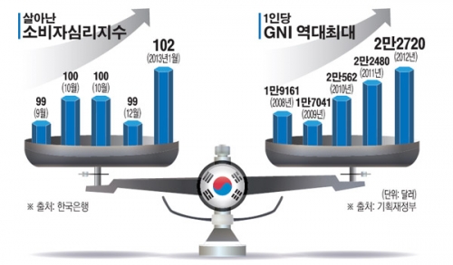 다만 GNI 증가율은 저성장과 환율 효과 영향으로 전년대비 1.0% 늘어나는데 그쳤다. 이는 지난해 실질 국내총생산(GDP) 증가율(2.0%)의 절반 수준으로 국가경제 규모 증가보다 국민생활 수준 성장이 더딘 것으로 나타났다.