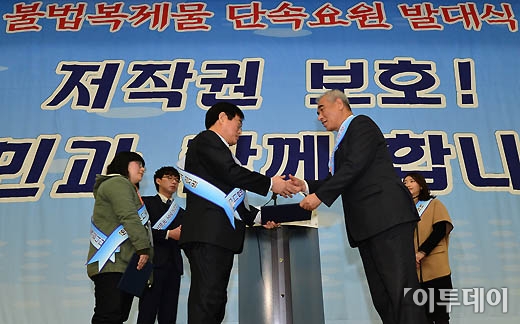 최광식 문화체육관광부 장관이 28일 서울 상암동 문화콘텐츠센터에서 '2013년 불법복제물 단속요원 발대식'에 참석해 모니터링 요원들에게 임명장을 수여하고 있다.