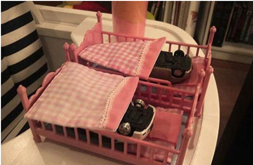 딸에게 사준 장난감 자동차에는 유아용 식탁 위 핑크색 장난감 침대에 나란히 누운 장난감 자동차의 모습이 담겨 있다. 딸에게 사준 장난감 자동차를 마치 사람 인형처럼 침대에 눕혀 놓은 것이다. 특히 바퀴가 하늘을 향한 채 잠든 장난감 자동차가 시선을 끈다.