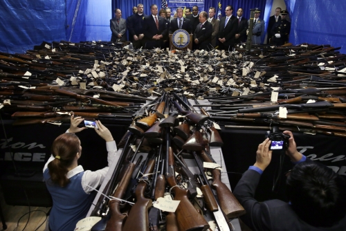 제프리 치사 뉴저지주 법무장관이 29일(현지시간) 지난 26일부터 이틀간 총기 환매 프로그램을 시행해 2600정을 사들였다고 밝혔다. 이 중 700개는 합법적인 총기라고 덧붙였다. 뉴저지/AP연합뉴스