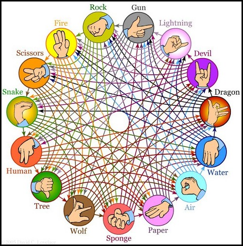 여기서 하나의 손동작은 7개의 다른 손동작에 이기거나 지게된다. 예를 들어 가위가 이기는 것은 뱀, 사람, 나무, 늑대, 스펀지, 종이, 공기이고 반대로 지는 것은 물, 용, 악마, 빛, 총, 주먹, 불이다.