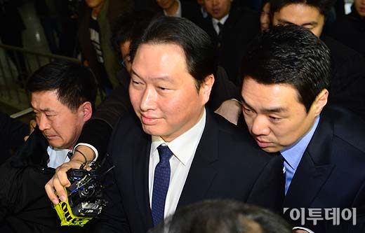 계열사에서 선지급 명목으로 497억원을 횡령하고 비자금 139억5천만원을 조성해 개인 용도로 사용한 혐의로 불구속 기소된 SK 최태원 회장이 31일 오후 선고 공판에 출석하기 위해 서울 서초동 중앙지법으로 들어서고 있다.