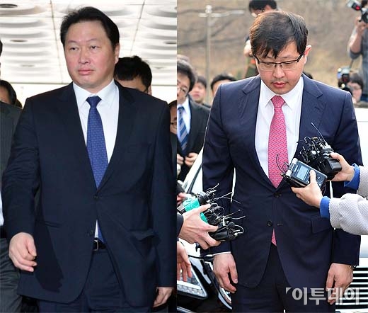 회삿돈 수백억 원을 빼돌린 혐의로 기소된 최태원(왼쪽) SK그룹 회장과 최재원 SK그룹 부회장이 31일 오후 서울 서초동 서울중앙지방법원에서 열린 선고공판에 출석했다. 서울중앙지법 형사합의21부(부장판사 이원범)는 특정경제범죄가중처벌법상 횡령·배임 등의 혐의로 기소된 최 회장에게 징역 4년을 선고하고 법정구속한 반면 최재원 부회장에게는 무죄를 선고했다.