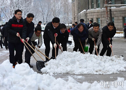 수도권에 최고 16cm의 폭설이 내린 4일 서울광장 인근에서 시청 직원들이 제설작업을 하고 있다. 서울에 이 같은 폭설이 내린 것은 2001년 2월15일 23.4㎝ 이후 12년 만이다.