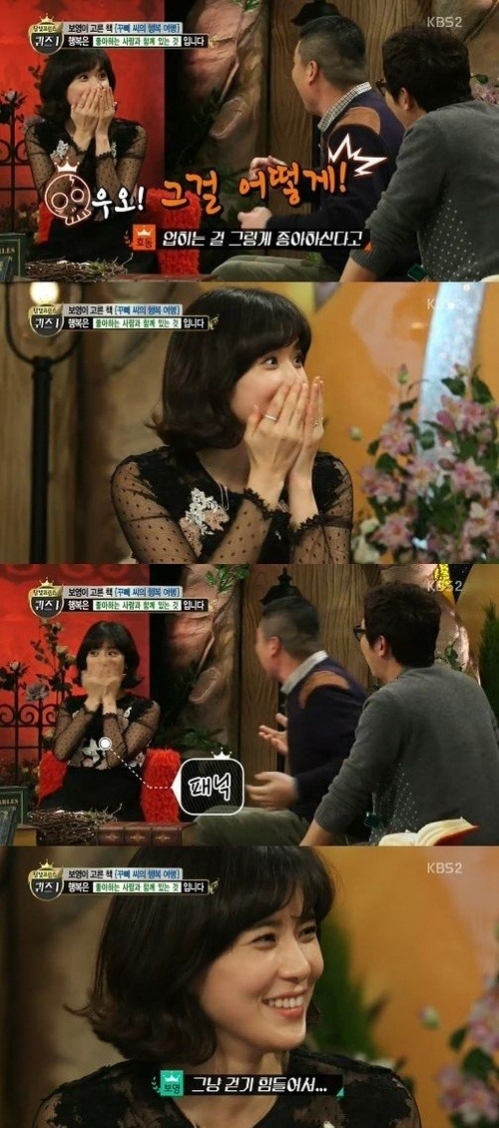 강호동이 질문 강도를 한층 높여 "스킨십을 좋아하냐"고 묻자 이보영은 또 얼버무렸다. 그러자 강호동은 사랑하는 사람 간의 표현에 대해 감상적으로 얘기하다가 갑자기 "업히는 걸 좋아한다고 하는데?"라고 단도직입적으로 물었다.
