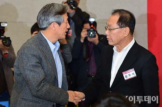 새누리당 황우여 대표와 정몽준 전 대표가 6일 오전 서울 용산구 효창동 백범기념관에서 열린 ‘제2차 국회의원ㆍ당협위원장 연석회의’에서 대화를 나누고 있다.