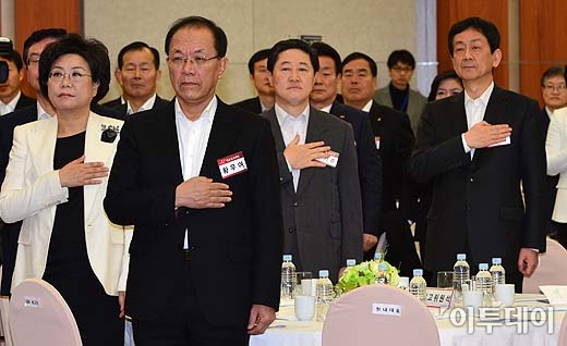새누리당 황우여 대표와 진영 정책위의장 등 지도부와 참석자들이 6일 오전 서울 용산구 효창동 백범김구기념관에서 열린 ‘제2차 국회의원ㆍ당협위원장 연석회의’에서 국민의례를 하고 있다.