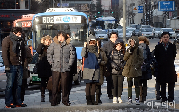 서울 아침 체감 온도가 영하 20도까지 떨어지는 등 올 겨울 들어 가장 매서운 한파가 몰아치고 있는 7일 오전 서울 광화문 네거리에서 시민들이 몸을 잔뜩 움츠리고 신호를 기다리고 있다. 기상청은 내일 아침 기온이 서울 영하 17도까지 떨어지는 등 설연휴 내내 영하의 강추위가 이어질 것이라고 예보했다.