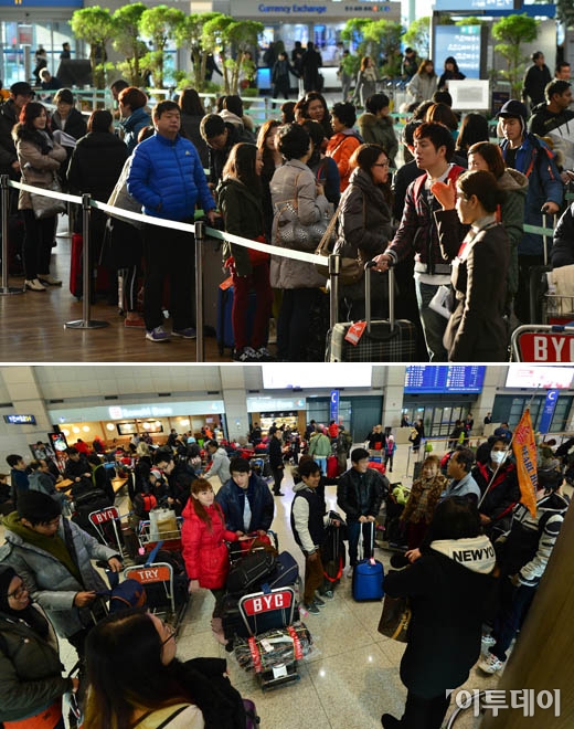 급격한 원화절상과 엔화약세가 이어지고 있는 가운데 설 연휴를 이틀 앞둔 7일 인천국제공항 출국장에 많은 사람들이 해외여행을 위해 줄은 서고 있다.(위) 한편 중국 춘절을 연휴를 앞틀 앞두고 중국 관광객이 인천공항을 통해 한국을 찾고 있다.(아래) 한국관광공사는 이번 춘절 연휴기간에 한국을 찾는 중국 관광객이 지난해보다 25% 늘어난 6만3000명에 이를 것으로 전망했다.