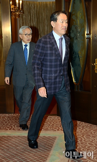 허창수 전경련 회장과 정병철 부회장이 7일 오전 소공동 플라자호텔에서 열린 전경련 정기이사회에 참석하고 있다. 이날 열린 이사회에서는 허창수 회장과 정병철 부회장의 연임 여부를 논의할 예정이다.