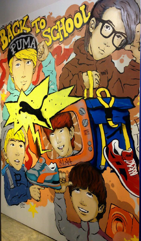 이 B1A4 그래피티는 푸마(PUMA)의 브랜드 아이콘으로 선정된 것을 기념해 국내외 관광객들이 몰리는 서울 명동 푸마 매장에 그려진 것.
