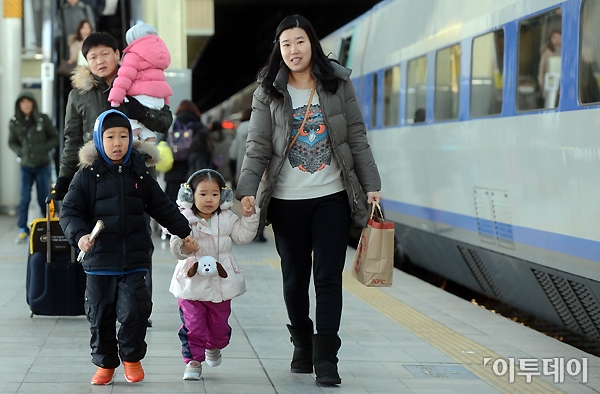 서울 아침 최저기온이 영하 17도까지 떨어지는 등 전국적으로 한파가 몰아치고 있지만 설을 앞두고 고향으로 향하는 시민들의 얼굴엔 따뜻함이 가득하다. 8일 오전 서울역에서 한 가족이 KTX 열차를 타고 있다. 노진환 기자 myfixer@