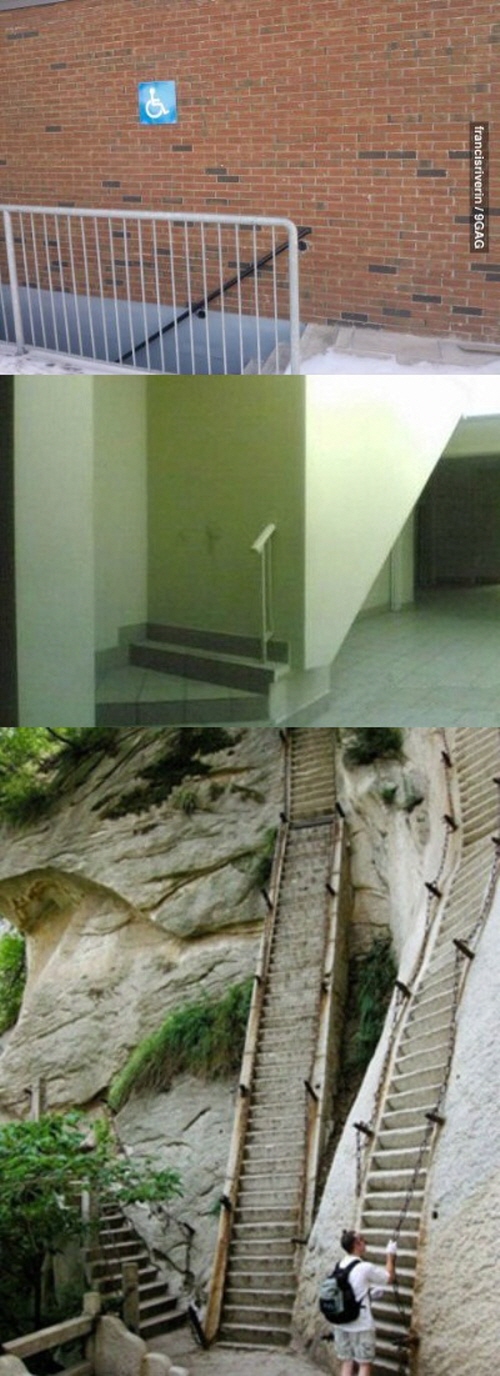 첫 번째 사진 속 계단 앞에는 장애인 안내표지판이 붙어 있다. 하지만 이 계단은 휠체어를 탄 채로는 이용할 수 없다. 비장애인 만을 위한 계단으로 설계되어 있기 때문. 두 번째 사진 속 계단은 만들려다 만 것 같은 황당한 형태를 하고 있다.