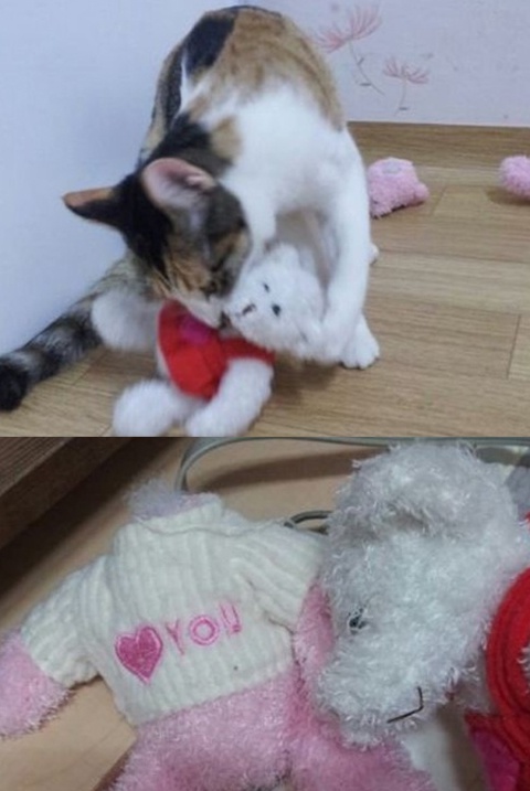 공개된 사진 속에는 나란히 배치되어 있는 분홍색과 흰색의 커플 곰 인형의 모습이 담겨 있다. 고양이는 이 가운데 분홍색 곰 인형의 머리와 몸을 이빨로 두 동강낸 후, 흰색 곰 인형마저 공격하는 잔인함을 선보인 것.